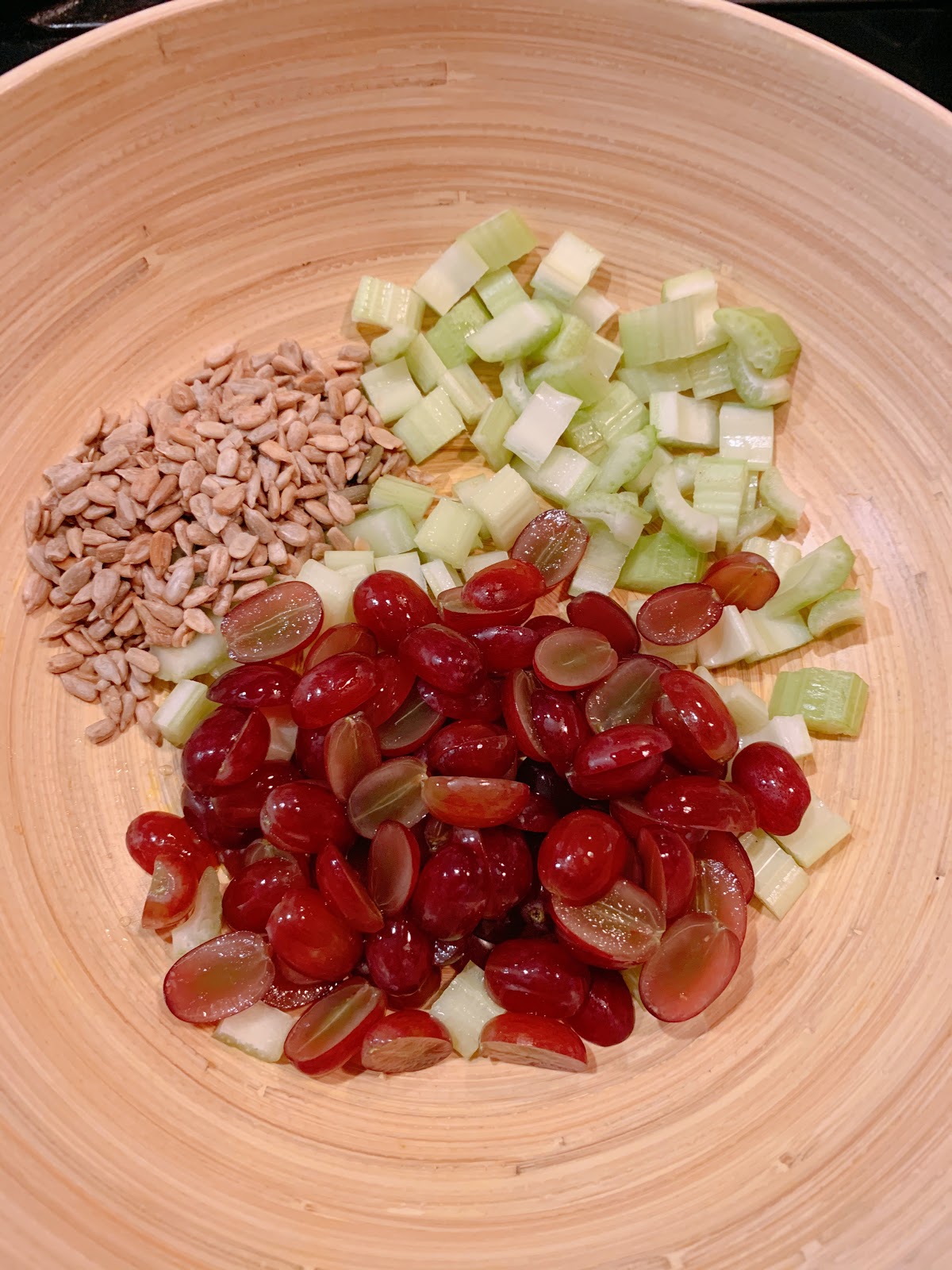 - Add chopped celery, grapes, and sunflower seeds to a large bowl.